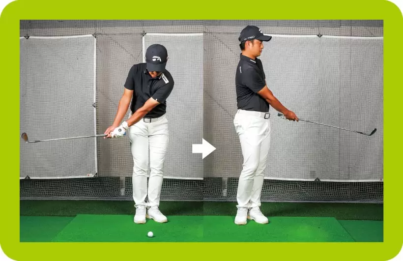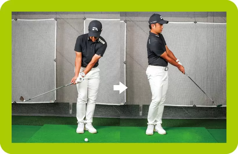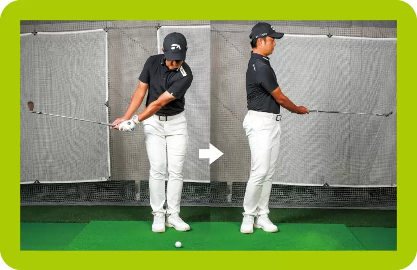胸を少しオープンにして構えだけで、少しアウトサイド気味に上がり、意識しなくてもヘッドが適正に上から入る。フォローでは低い位置にクラブが抜けるイメージを持とう。