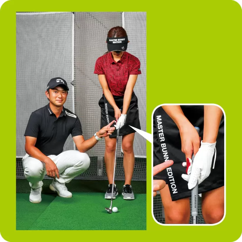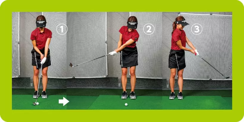 ①クロスハンドに握り、基本のカタチでアドレスする。 ②早くほどくことができないので、自然にリリースできる。 ③あおり打つこともできないので、フォローも決まる。