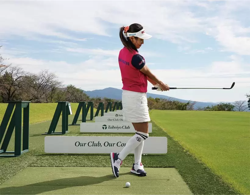 「ニー」でバックスイング。手先で上げないで、カラダの回転で上げていくことが大事。