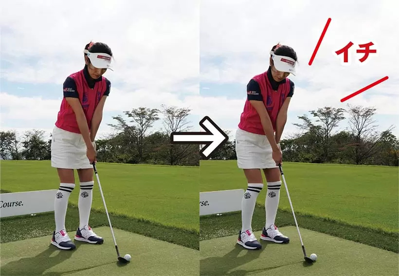 スイングのリズムを整える一つの方法。アドレスしたら重心を少し下げて「イチ」。