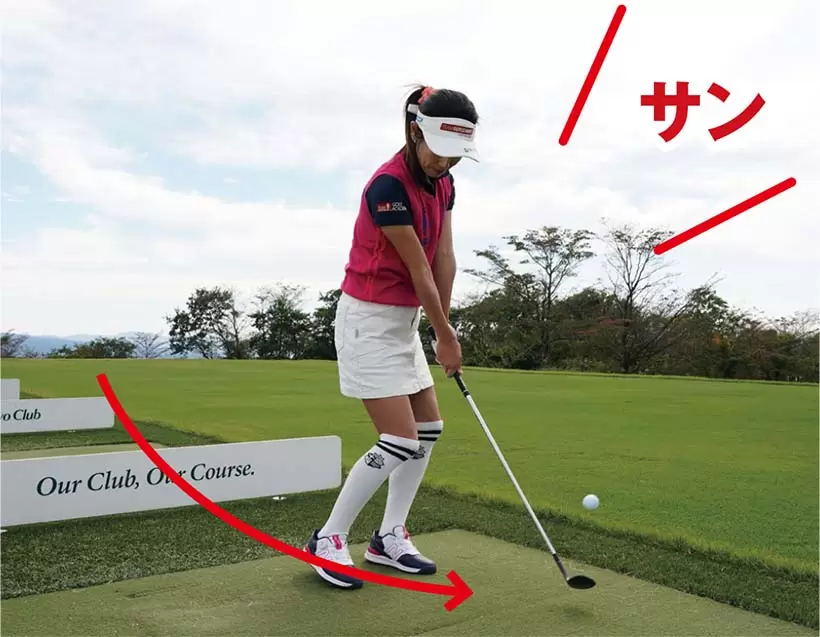「サン」でダウンスイングし、ボールをヒット。リズムを意識すれば打ち急ぎを防げる。