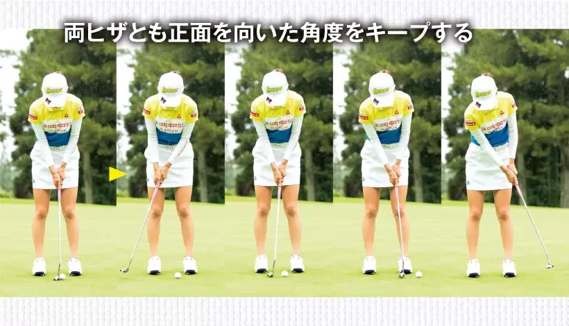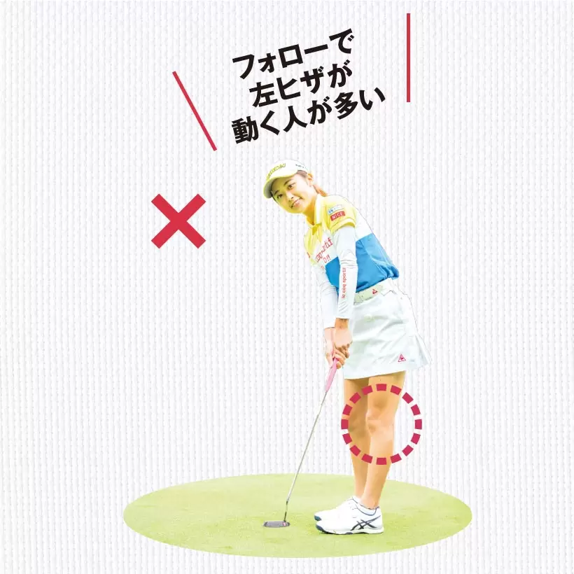 特にロングパットではヘッドの動きに合わせて、フォローで左ヒザが目標方向に回転してしまう人が多い。