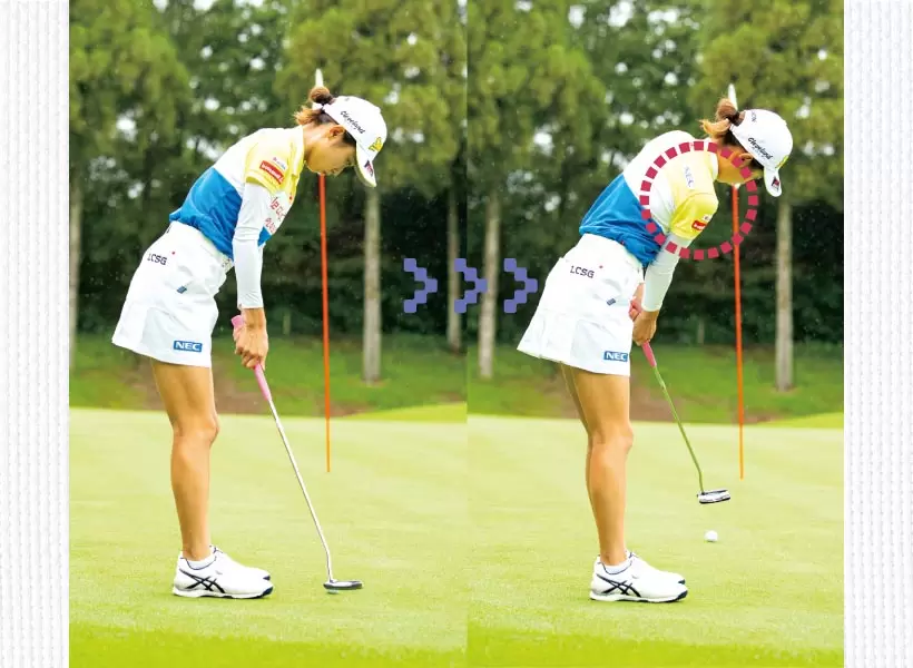 安田はパッティングのアドレスでも深くヒザは曲げずに、アイアンショットに近い浅めの前傾角度になっている。