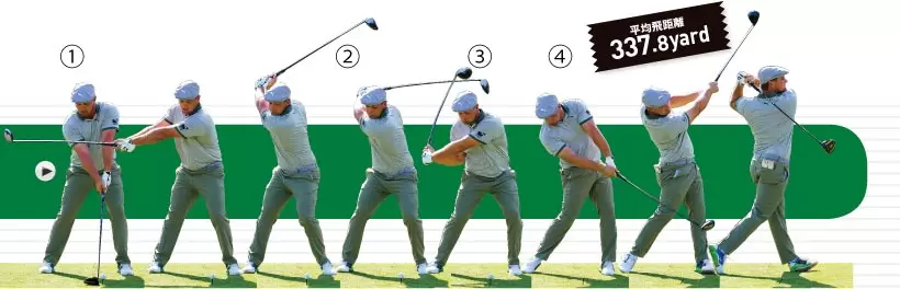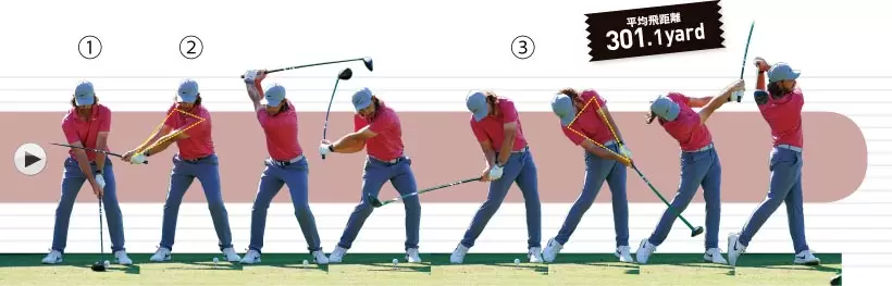 ①クラブが真っすぐ立つようなトップを作っている。②切り返しでクラブを背中側に倒してインサイドから振り下ろす。③マシューも腕のローテーションを抑えてインパクトしている。