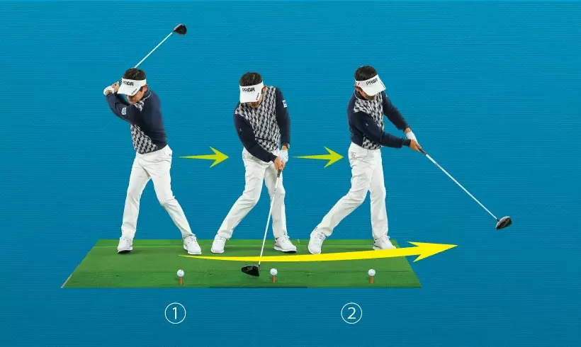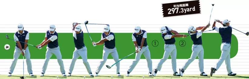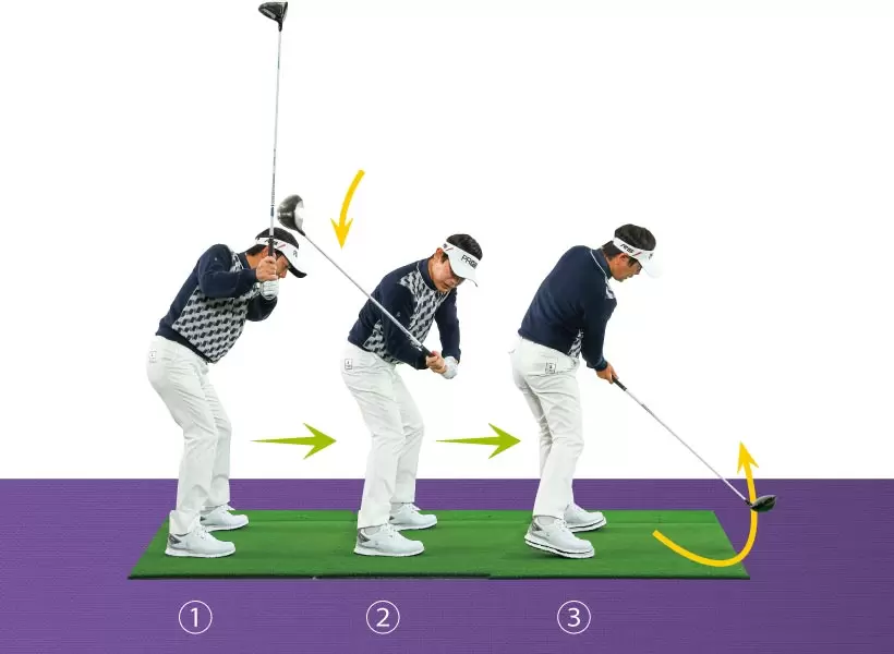 ①クラブヘッドをカラダから遠ざけるイメージでバックスイング。②切り返しでカラダを沈み込ませるようにして大きなタメを作る。③インパクトエリアでフェースターンしない。カラダの回転だけでとらえるイメージだ。