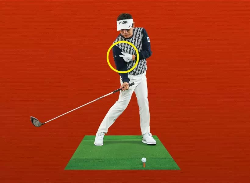 ダウンスイングでは胸の開きを抑えてクラブを振り下ろす