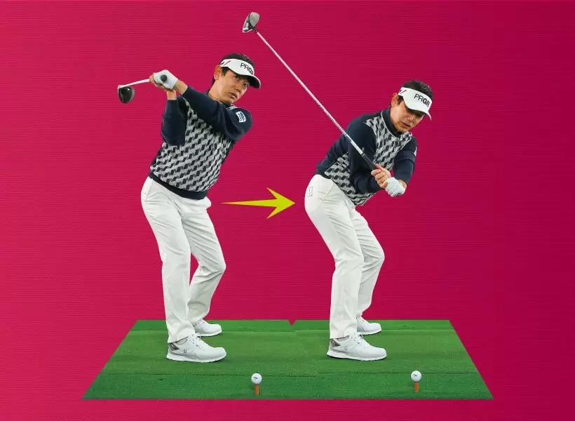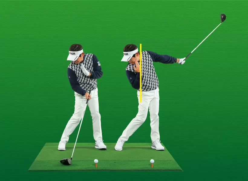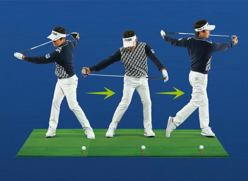 バックスイング側とフォロースルー側のカラダの回転量を均等にする感覚のスイングだ