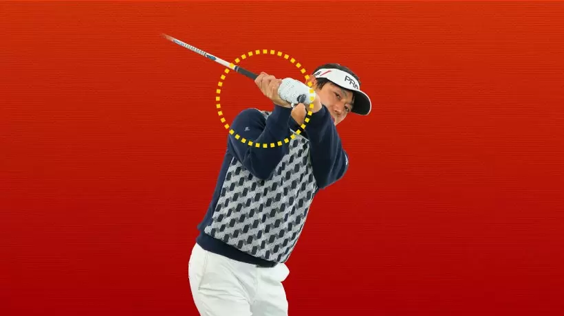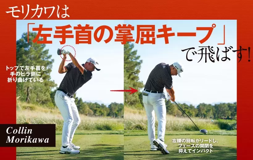 トップで左手首を手のヒラ側に折り曲げている/左腰の回転がリードし、フェースの開閉を抑えてインパクト