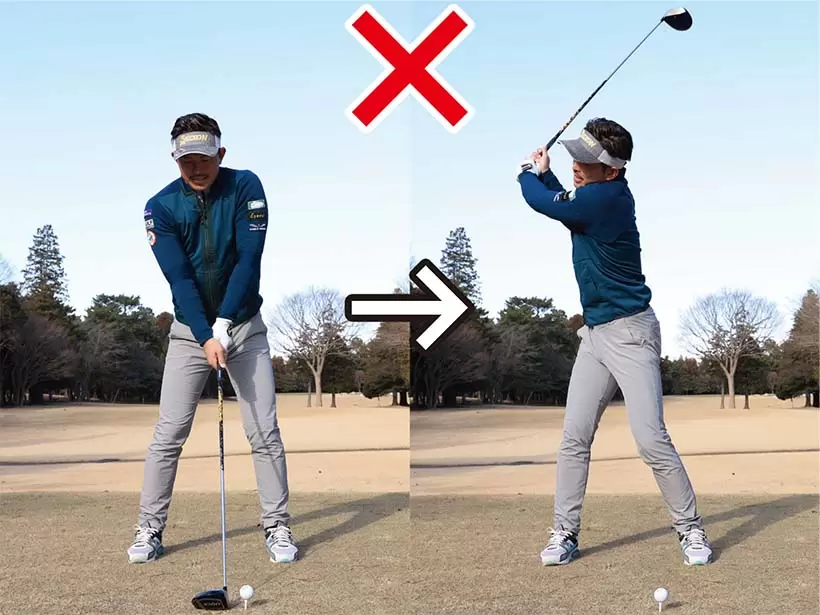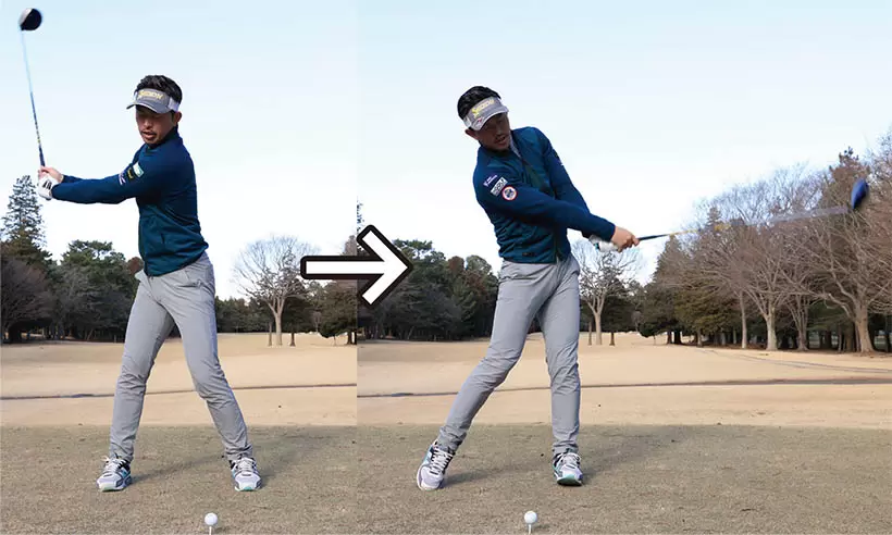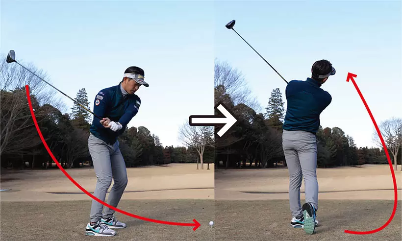 両手に力を入れすぎると手首が硬くなり、クラブが左回りしやすい。これがアウトサイドから下りてしまう原因となる。