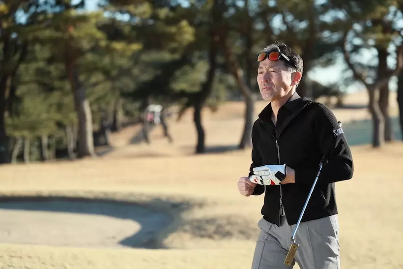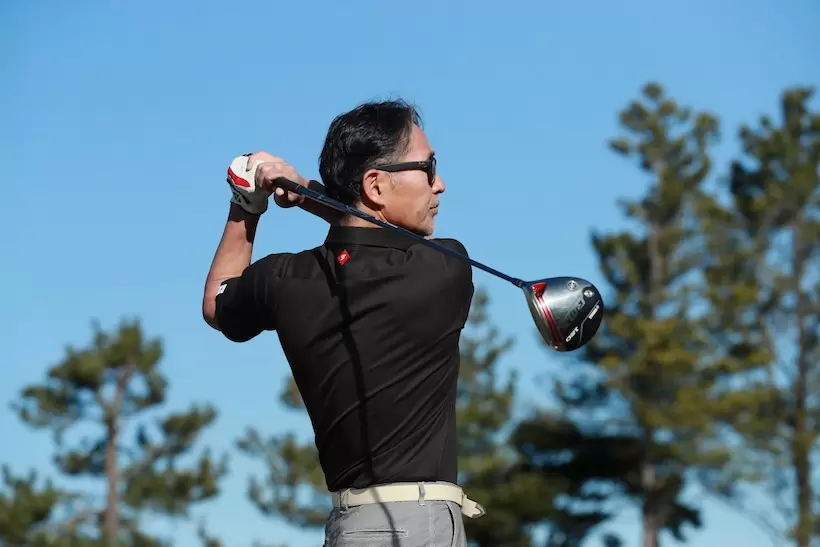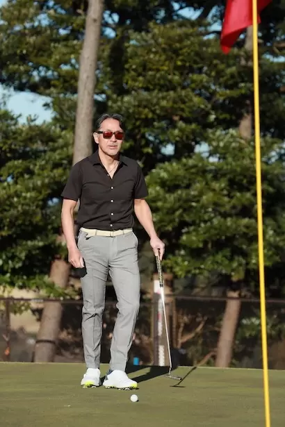永久プリーツ加工によりクリースラインがビシッと入ったパンツはドレッシーに見えるが、ストレッチ性が高いため、ゴルファーの動きを邪魔しない。