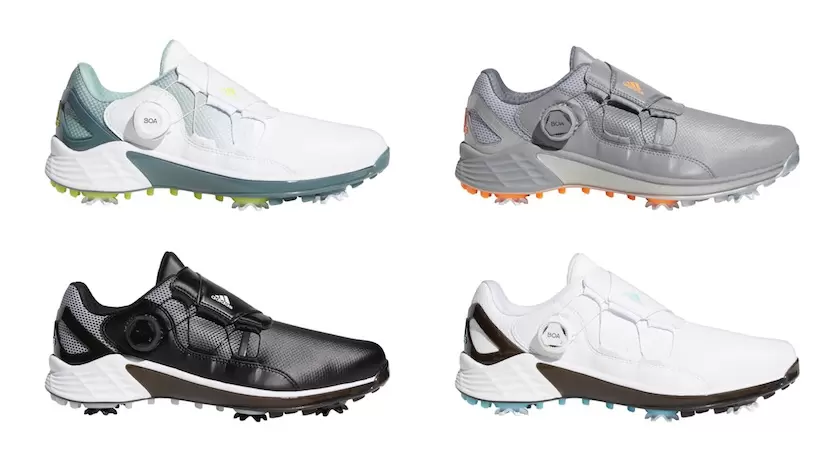 「ホワイト/コアブラック/ヘイジースカイ」(左上)「コアブラック/ホワイト/ライトグレーヘザー ソリッドグレー」(右上)、「ホワイト/アシッド イエロー/ブルーオキサイド」(左下)、「グレースリー/スクリーミングオレンジ/シルバーメタリック」(右下)