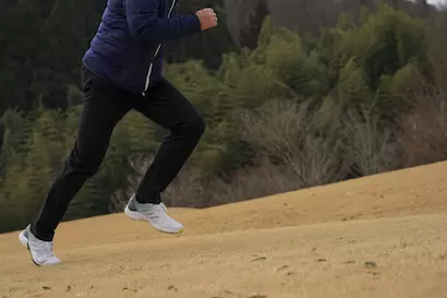 あまりの軽量感に思わず傾斜を走り出す編集者。「このシューズでサッカーもできそう(元サッカー部)」