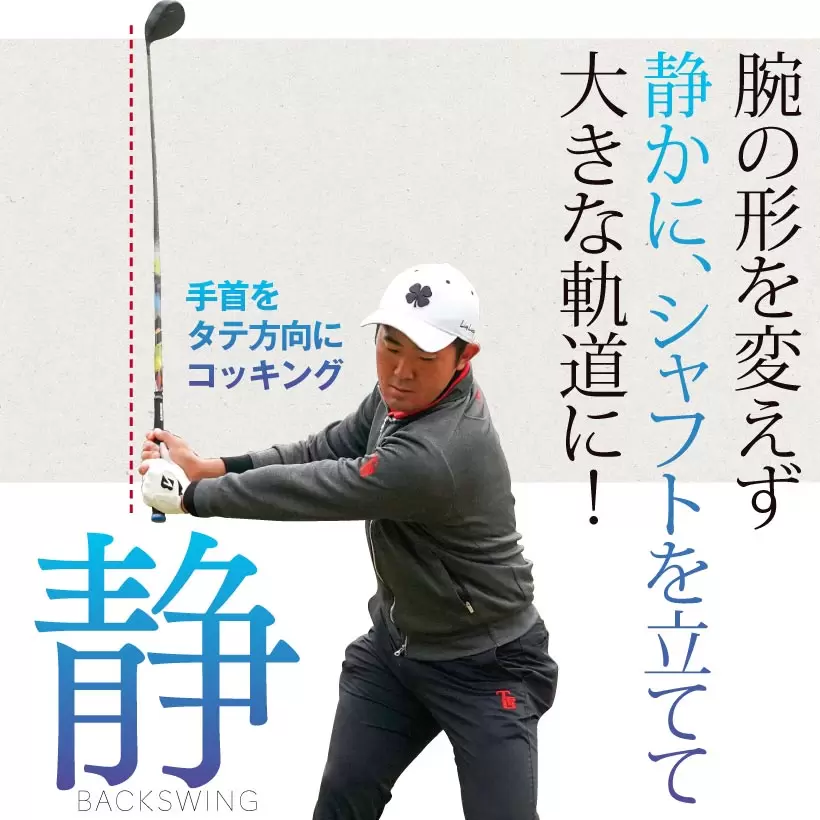 アマチュアにはコッキングで手首を横方向に曲げる人が多いが、金谷のように手首を柔らかく使いタテ方向に手首を折るコッキングができればシャフトが寝る動きにならない。