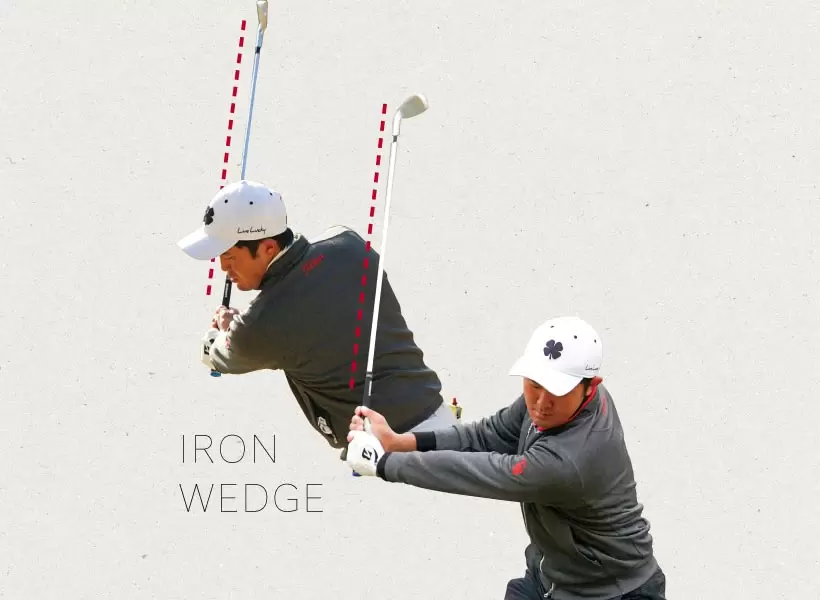 ドライバーやフェアウェイウッドのような長いクラブだけでなく、アイアンやウェッジでフルショットするときも金谷はシャフトを立てている。