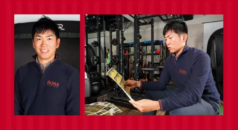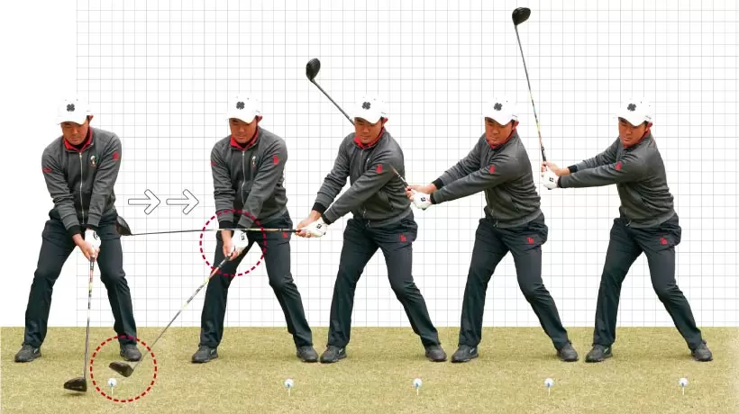 始動直後の写真(左から2枚目)を見ると、手首が右足の前におさまっているタイミングで、すでにヘッドはスタンスの外まで大きく動いている。手首を急に折らないのでヘッドが低い軌道になっている。