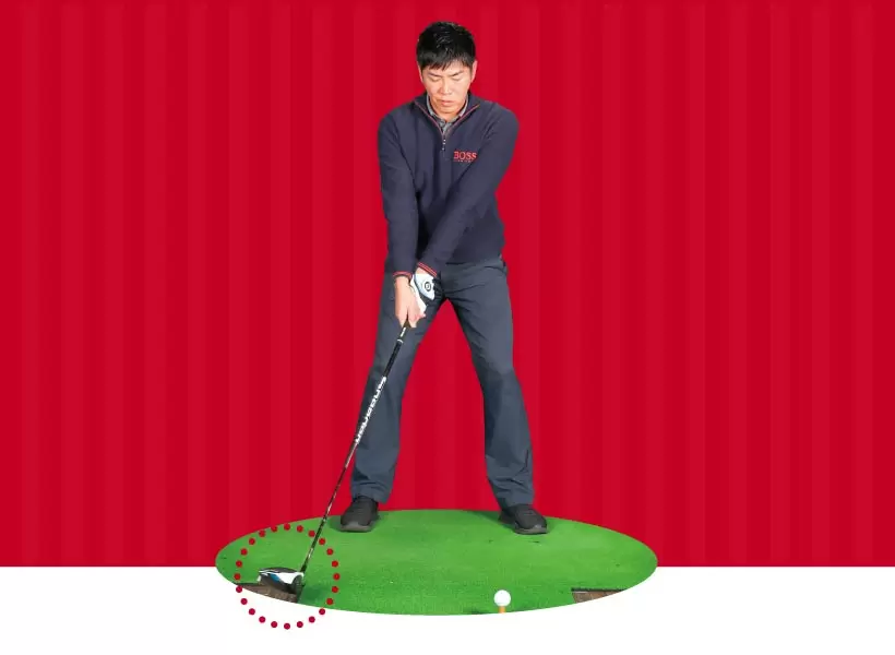 ヘッドがスタンスの外に出ても、ヘッドの高さはボールと変わらないくらい低い位置をキープすると、スイングアーク全体が大きくなる。