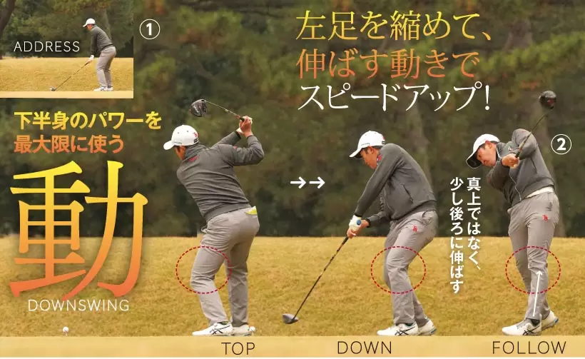 バックスイングもダウンスイングも左ヒザでタイミングを取るイメージが理想。トップで左ヒザを曲げて、ダウンスイングで踏み込むと下半身リードの感覚で打てる。