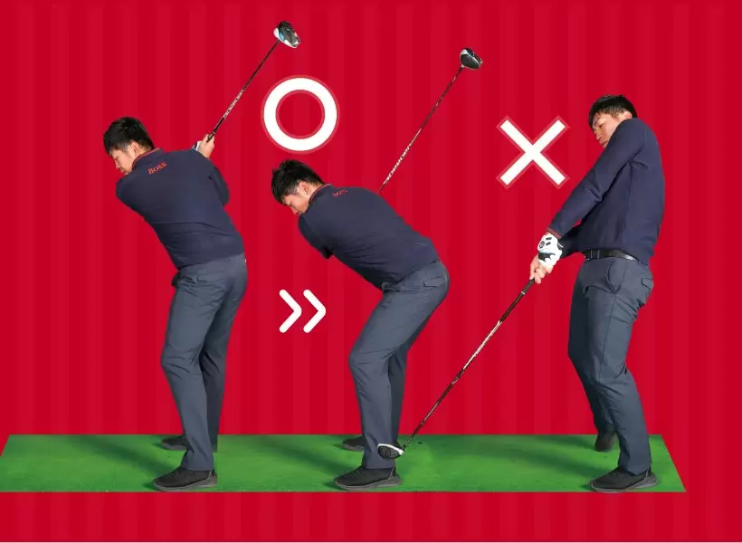 どうしても伸び上がる癖がある人はダウンスイングで、胸を地面に近づける感覚でスイングすると伸び上がりを防止できる。胸を近づけることで、お尻も後ろに下がるので体が突っ込まない。