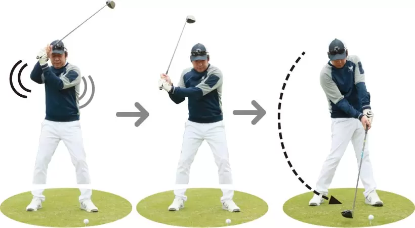ダウンスイングで、胸を右に向けたままクラブを振るイメージを持つ。すると、インサイドアウト軌道になり、ボールはフック系になる。腕もスムーズに返りやすい