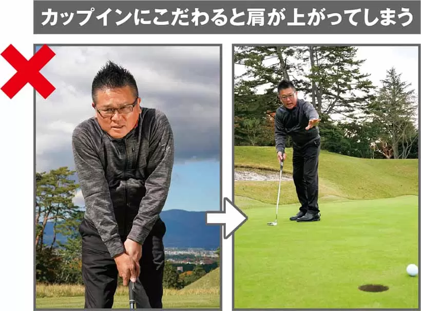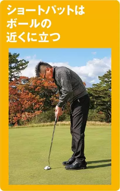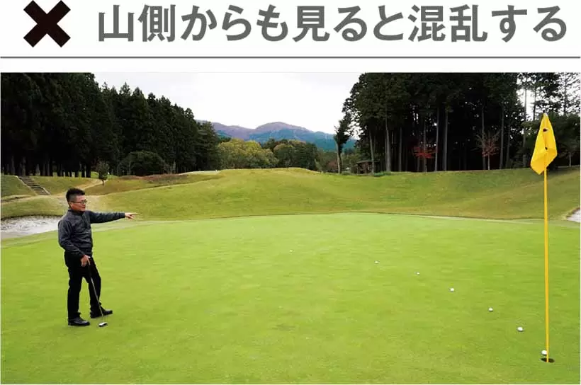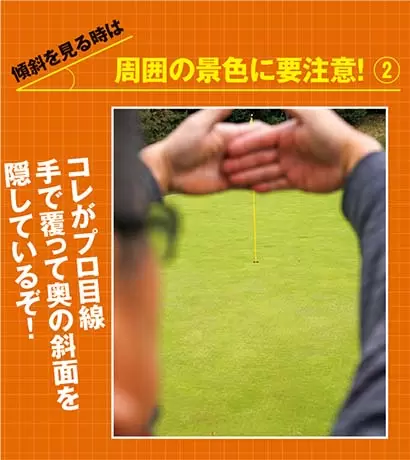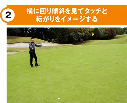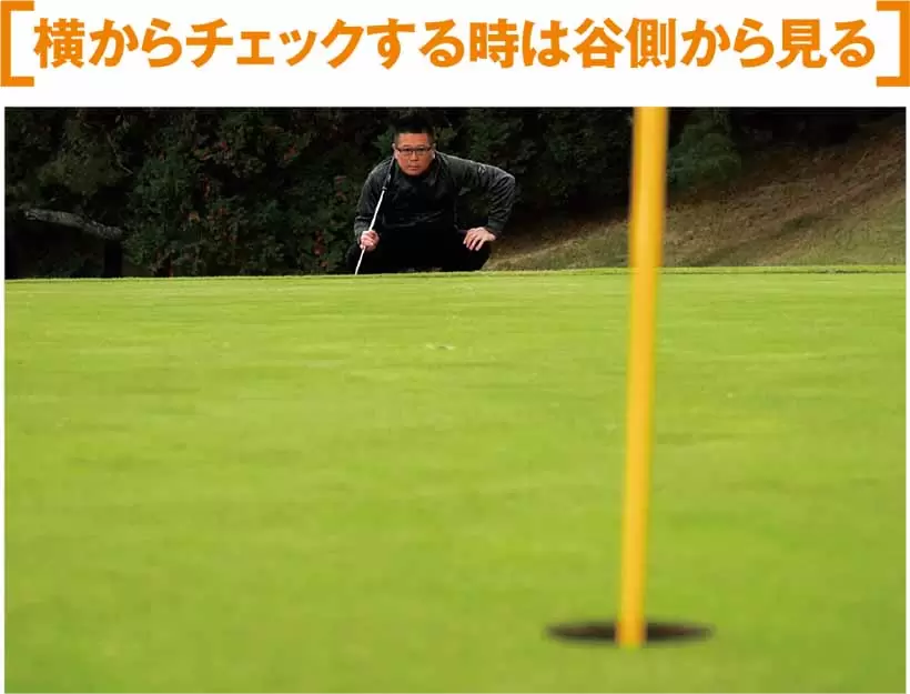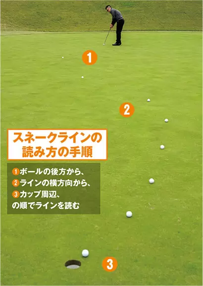 ❶ボールの後方から、 ❷ラインの横方向から、❸カップ周辺、の順でラインを読む