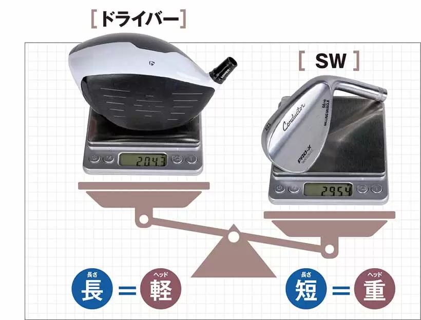 現在、ドライバーのヘッド重量は200g前後が主流。レングスが短くなるほど、スイングバランスを整えるためにヘッド重量は重くなる。そのためウェッジでは300g前後になる。