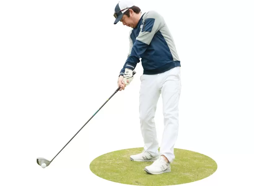 左ヒザがバックスイングで内側に流れなければ、ダウンスイング以降で伸びる。股関節が切れ上がって、地面もしっかり踏めるため、力を出せる。