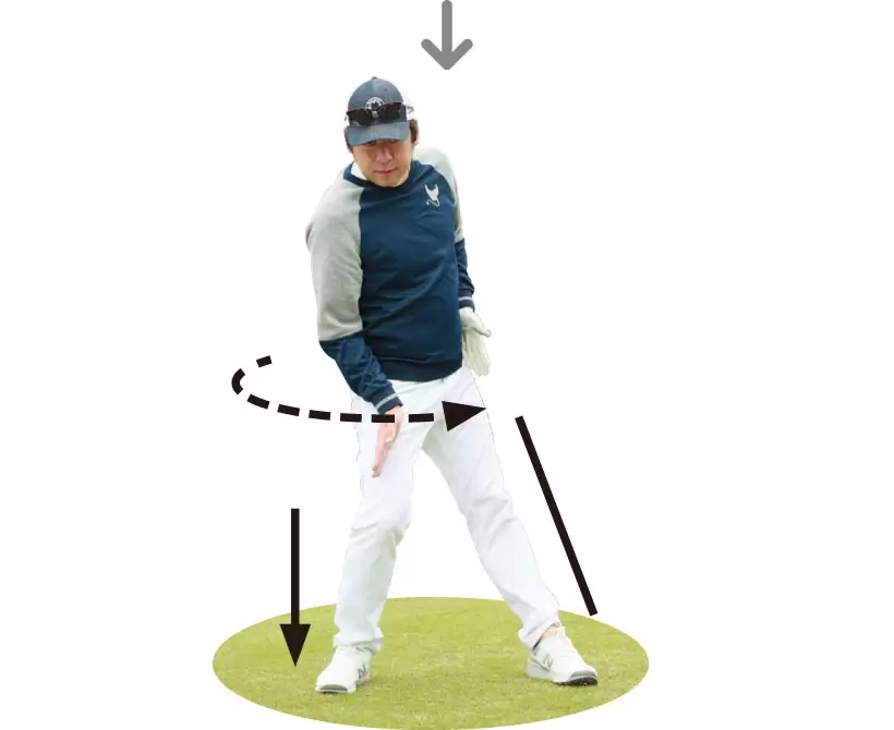 バックスイングでは、左の大腿骨の角度をキープして、左ヒザが内側に寄らないようにする。