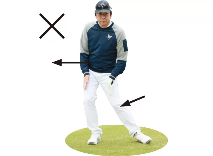 大腿骨とは、足の付け根からヒザまでの骨。ガニ股にするくらいに構えて、その角度をなるべく変えず、内側に寄らないようにすると、右サイドへのスエーや左サイドへのスライドが起きない。