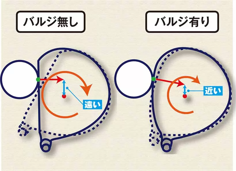 打球の衝撃はフェースの向きと垂直な方向に加わる。バルジがついていると、トゥ・ヒール方向に打点がブレた場合、衝撃がヘッド重心に近い方向にかかるため、ロスを軽減できる。