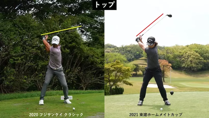 左が2020年のトップ、右が昨日のトップでその差は明らか。上体の捻転度合いや肩の回転度合いに大きな変化は見られないが、トップはコンパクトになっている。