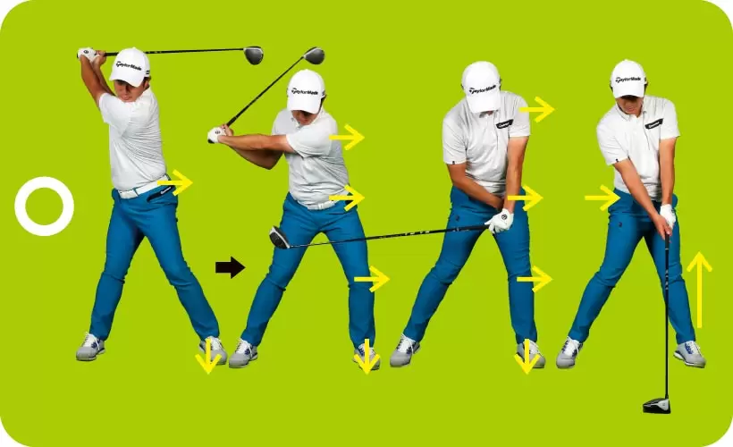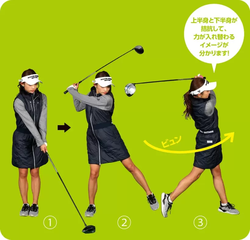 トップから左に乗り、インパクトまで左の動きを先行させていく。ネジれを解放する際のインパクトのイメージは、いまでいう「地面反力」。“左足を伸ばす”“右のお尻をつき出す”など、いろいろ表現されるが、感じ方は人それぞれでいい。