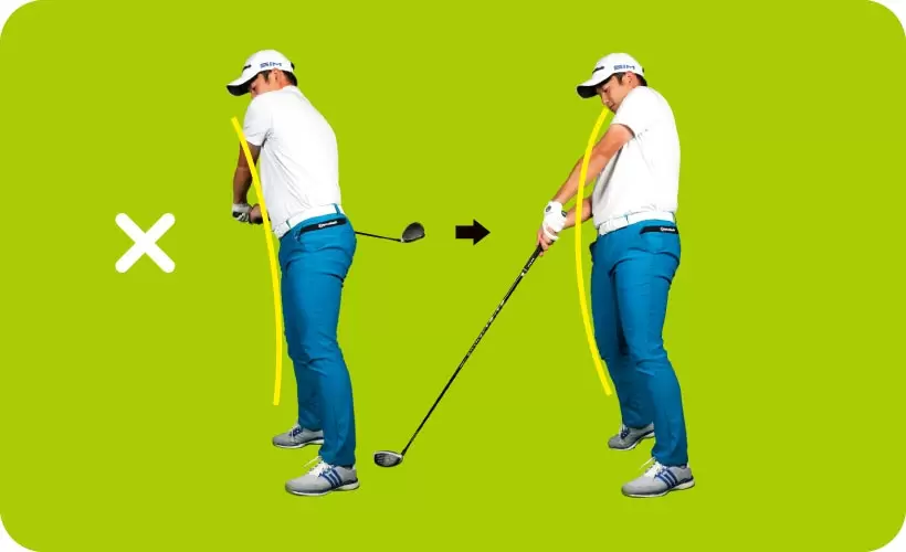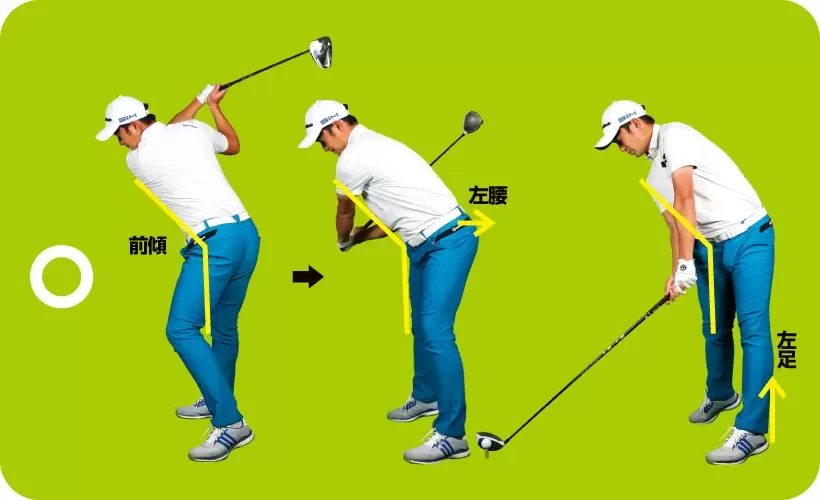 右のお尻を伸ばすのが早いと、カラダが起き上がり前傾角度をキープできない。結果クラブが届かず、ミスショットになる。