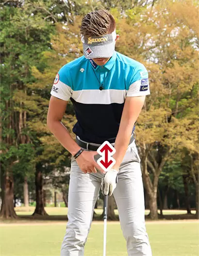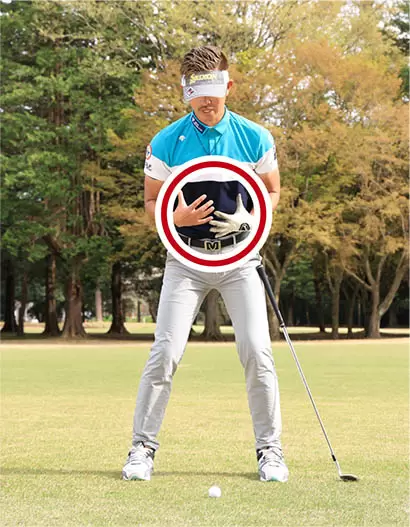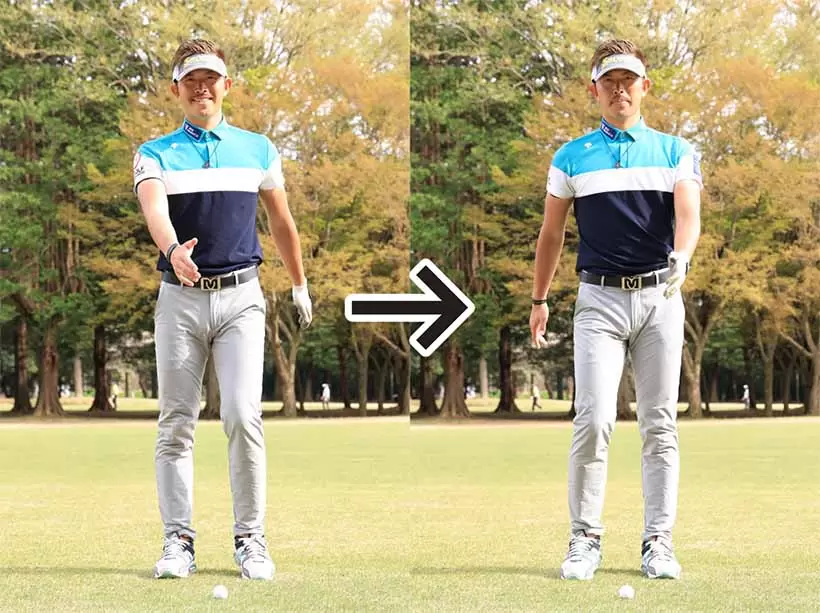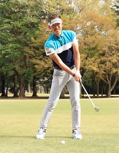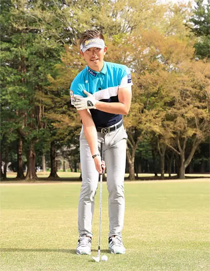 ボールの位置はスタンスの中央。両手を左モモのツケ根の前にセットし、両腕とクラブがy字のアドレスを作ろう。