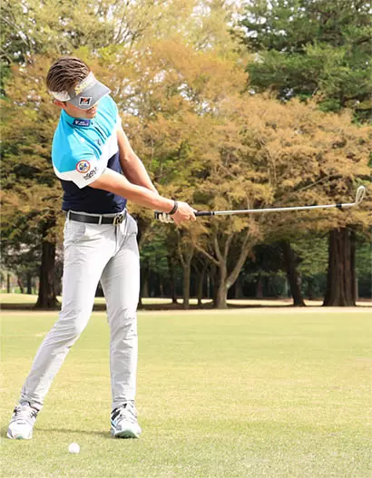 お腹を左に回してフォロースルーへと向かう。腕とクラブはお腹の回転に連動して自然に動くというイメージだ。