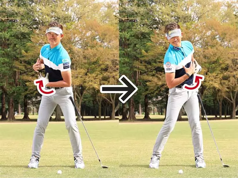 お腹の回転でバックスイング。グリップエンドとお腹の間隔をキープしよう。