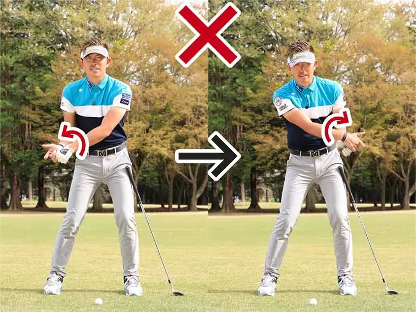 お腹の回転が止まると右手首をコネてしまう。こんな悪癖をつけないことだ。