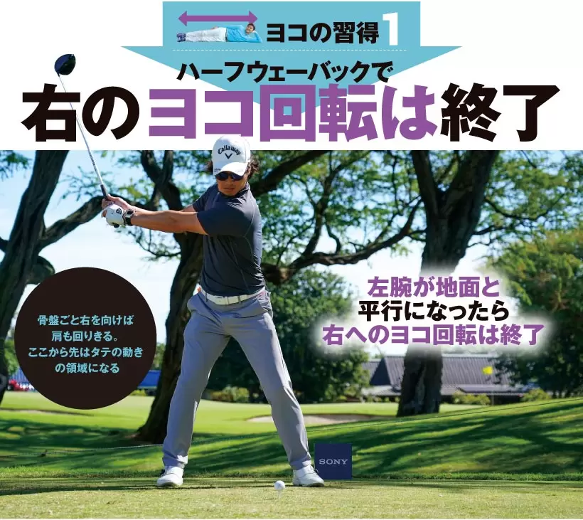 スイングのヨコ回転とは、お腹やお尻や骨盤といった体幹部を回すこと。そこがターンすれば胸や肩も自然に回る。