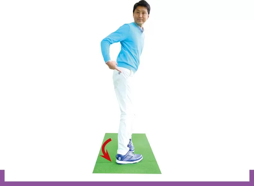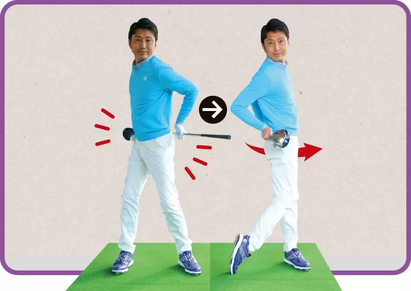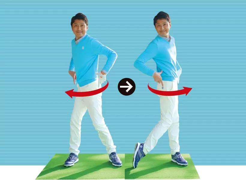左股関節を軸に骨盤ごと左を向けるイメージ。軸を変えてヨコ回転するとスエーせずに体重移動できる。