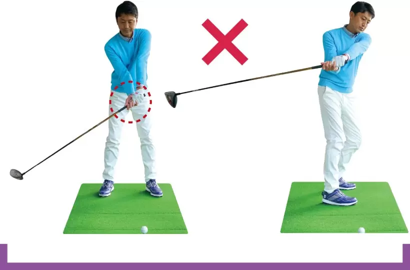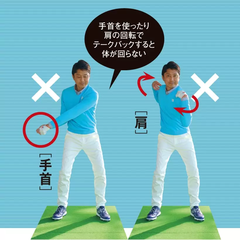 手首を使ったり肩の回転でテークバックすると体が回らない。