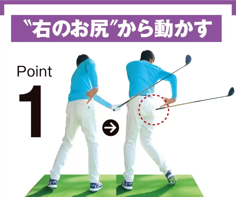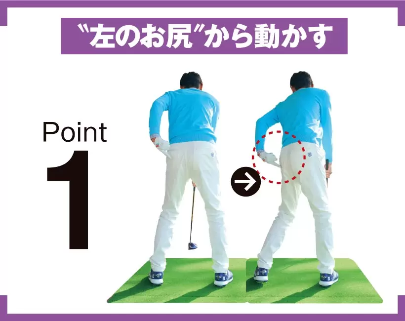 最初にピクッと動くのが左のお尻。クラブヘッドでも肩でもなく、この動きがテークバックのきっかけになる。