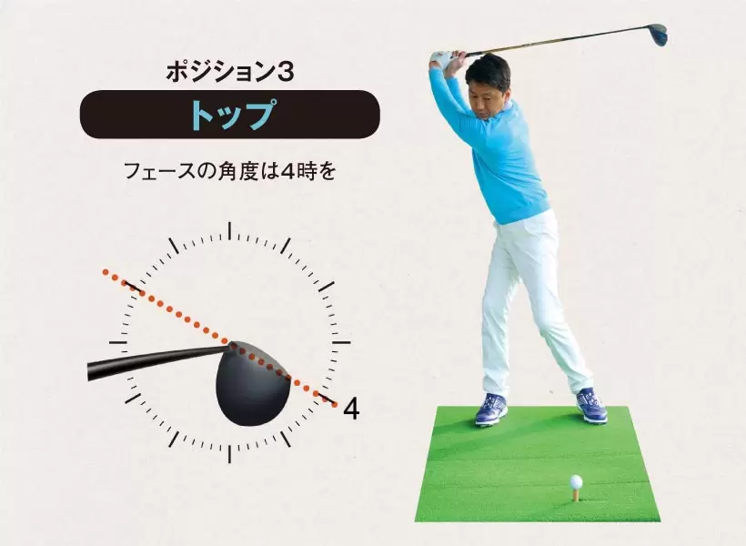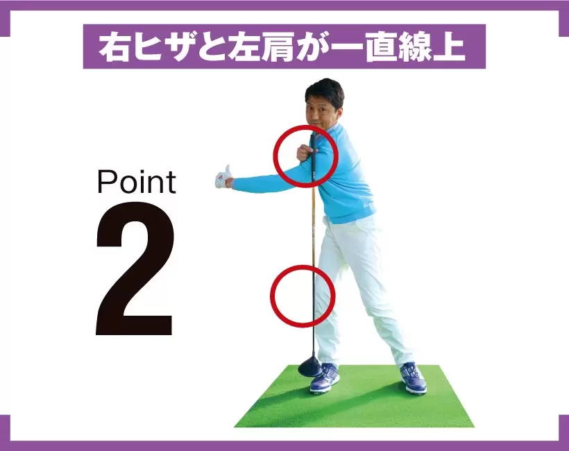 体幹が右を向ききったところからトップまでは、右ヒザと左肩が一直線上に位置するのが目安。