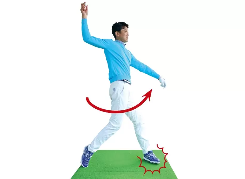 正しくヨコ回転できるとフィニッシュで両ヒザが近づき目標を向く。