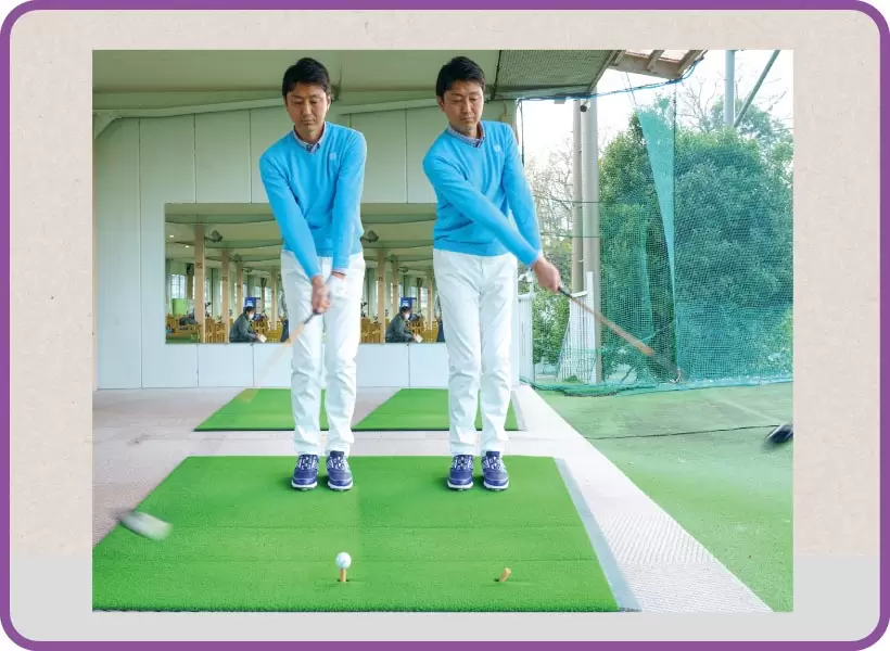 両足を揃えてティアップしたボールを打つ。スリークウォータースイングで打ち、着弾するまでボール見る。ヨコ回転できないとフィニッシュで止まれない。