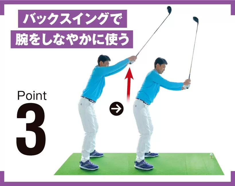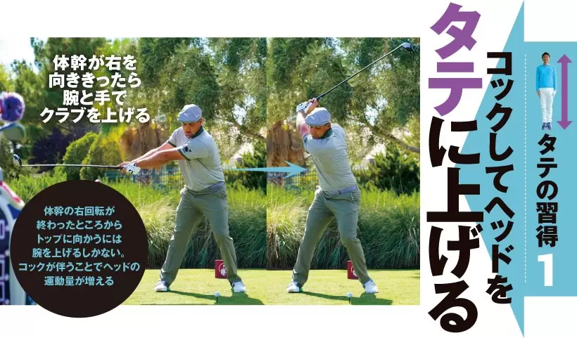 体幹の右回転が終わったところからトップに向かうには腕を上げるしかない。コックが伴うことでヘッドの運動量が増える。