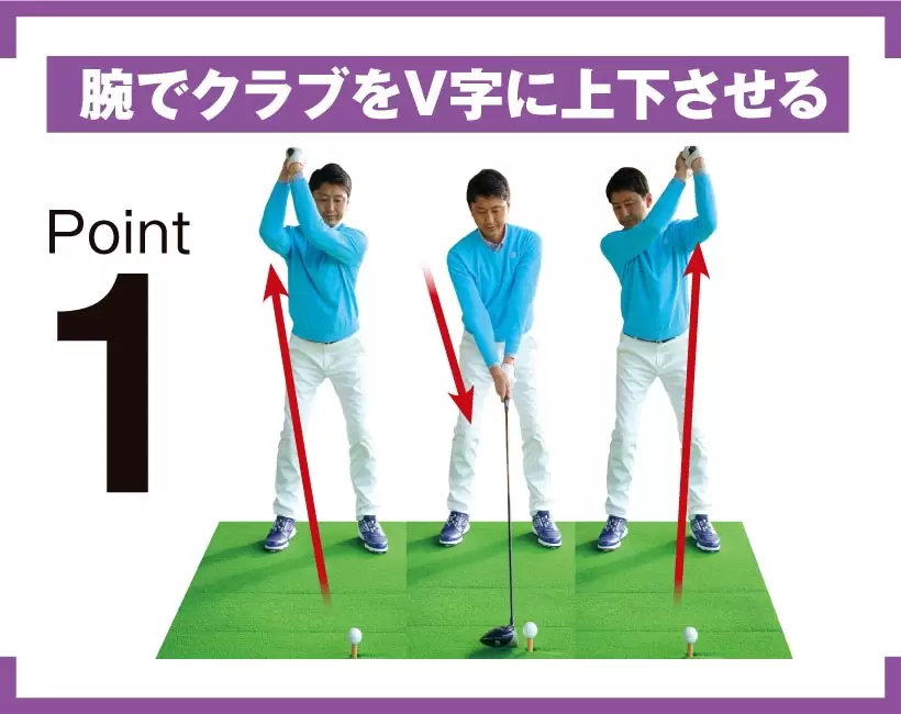 ヒジの曲げ伸ばしと手首のコックを併用、体の正面でV字にクラブを上げ下げするのがタテの動き。