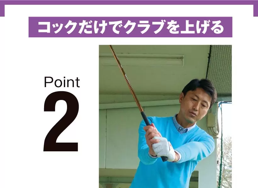 手首が制御するタテの動きはコックだけ。テークバックで手のヒラ側や甲側に折れてはダメ。両ヒジから先のロールも極力抑えたい。