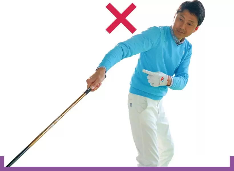 ヨコ回転にクラブのタテの動きを連動させるには、右ヒジを曲げたまま体の前の方に下ろすイメージをもって練習するといい。