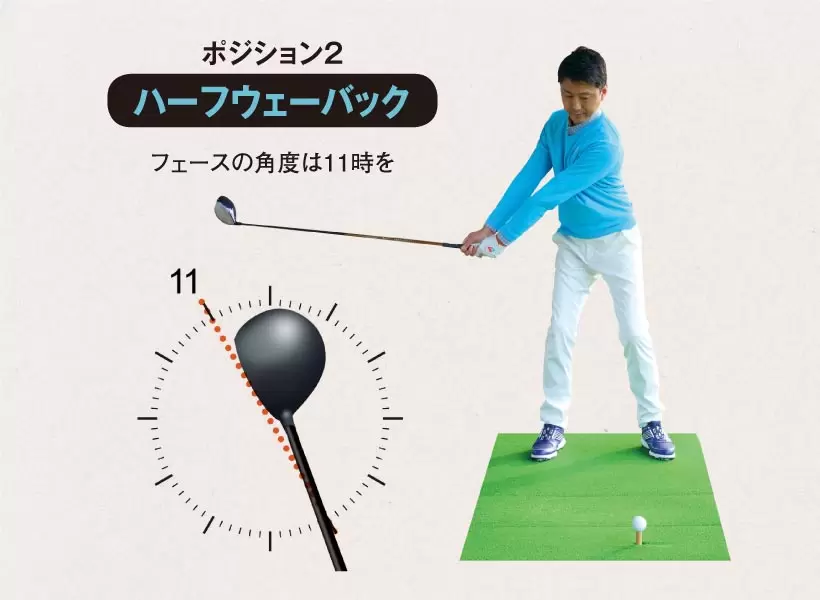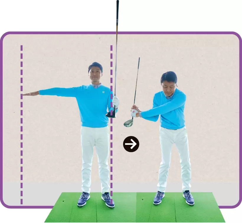 写真のように腰にクラブをあてがった状態で、体幹をヨコ回転させる。クラブの向きで腰が正しく左右に回っているかがわかる。