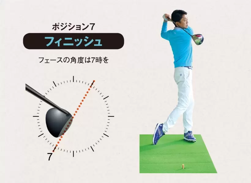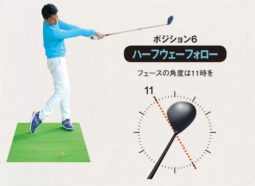 バックスイングの裏返しで、フォローで右腕が地面と平行になった時、左ヒザの上に右肩がくる。