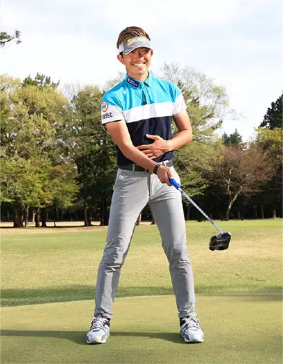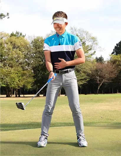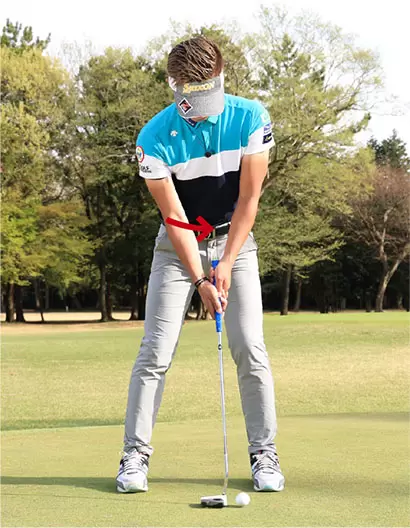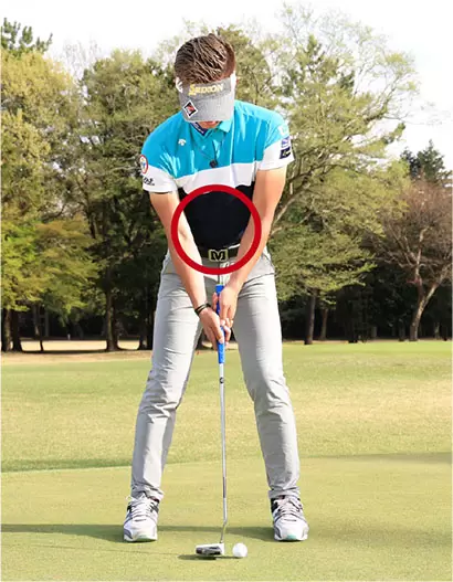 ドライバーなどのショットと同様、アドレスではお腹を引き締めて力を入れておくことが大事。
